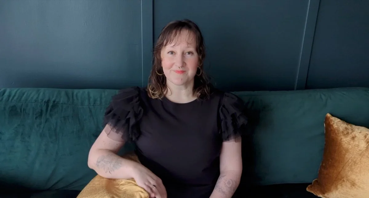 Video features Yuliya in an interior space with dark blue-green walls behind them. They are sitting on an emerald green couch, facing the camera, with two gold pillows next to them. They are wearing a black short sleeve shirt with tulle sleeves, shoulder length wavy brown hair and gold hoop earrings.